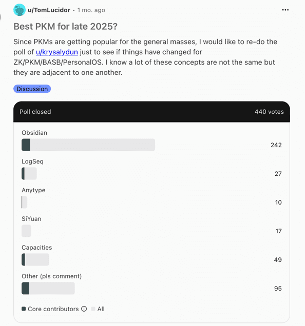 A recent community poll on r/PKMS (440 votes, late 2025) shows Obsidian as the clear favorite, followed by Logseq, with tools like Capacities and Anytype building smaller but loyal followings.