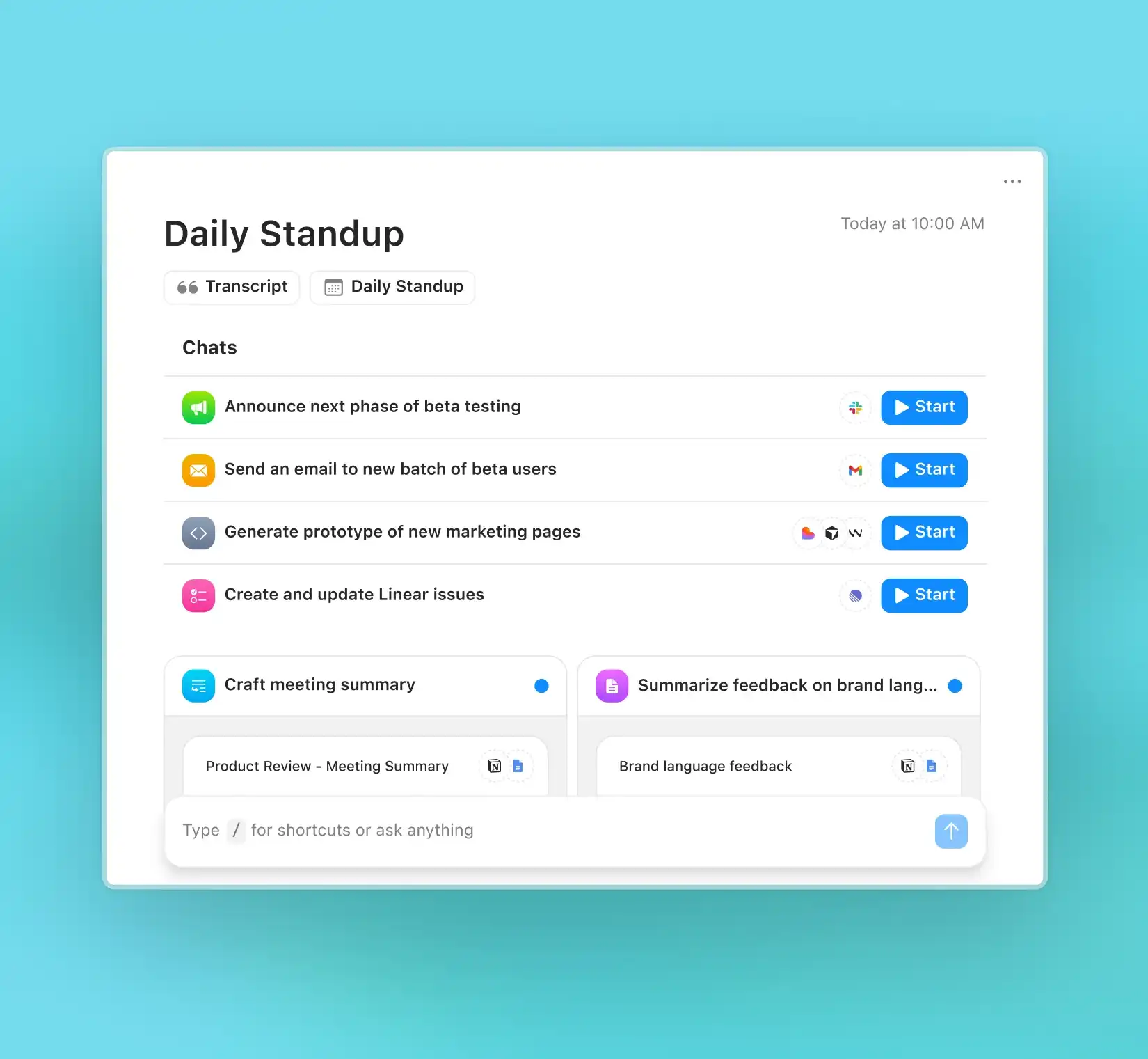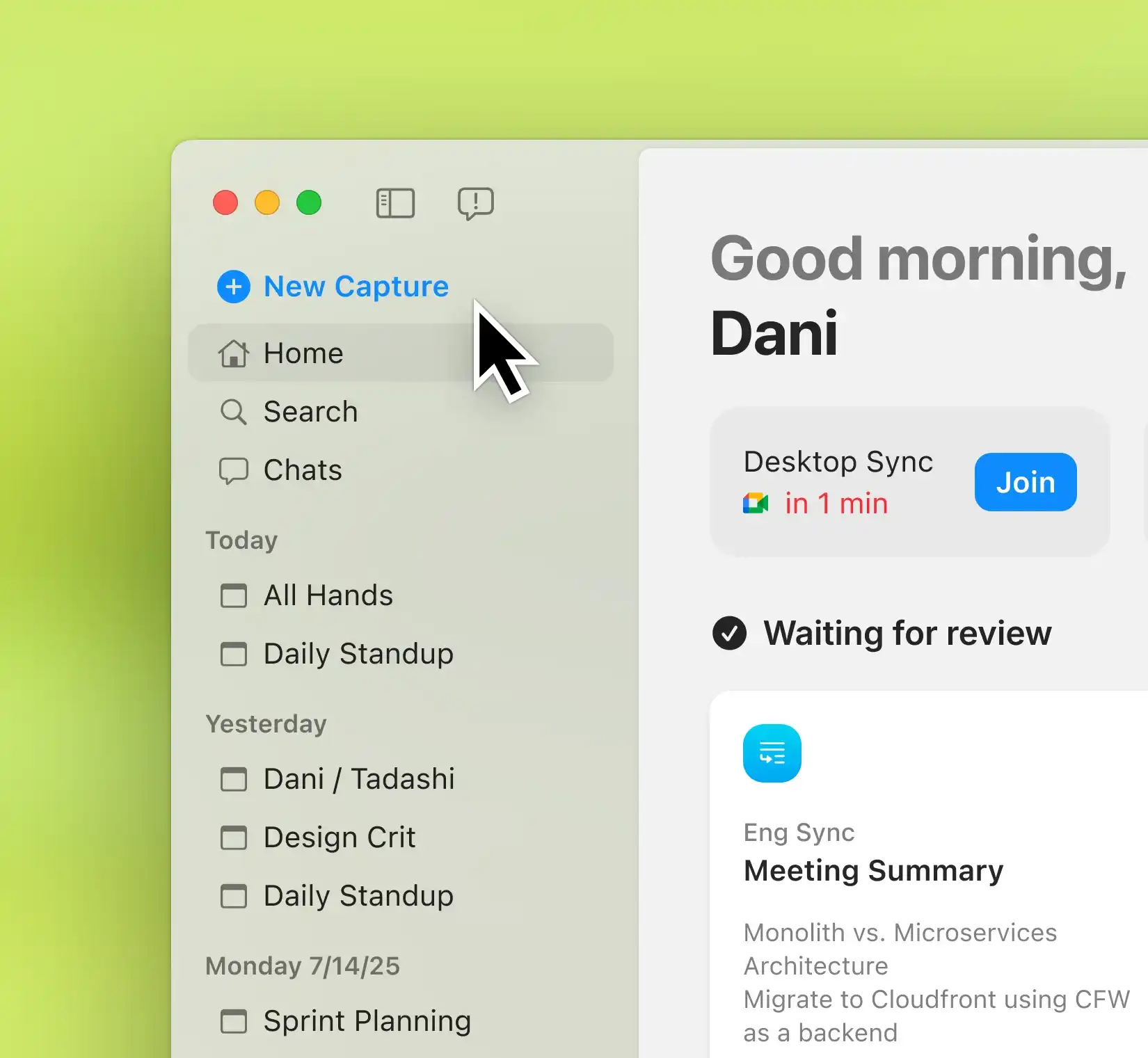 Radiant captures conversations wherever they happen — in the office, on Zoom, or in a Slack Huddle. It detects active discussions automatically, creating accurate summaries, next-step suggestions, and drafts of resulting work.