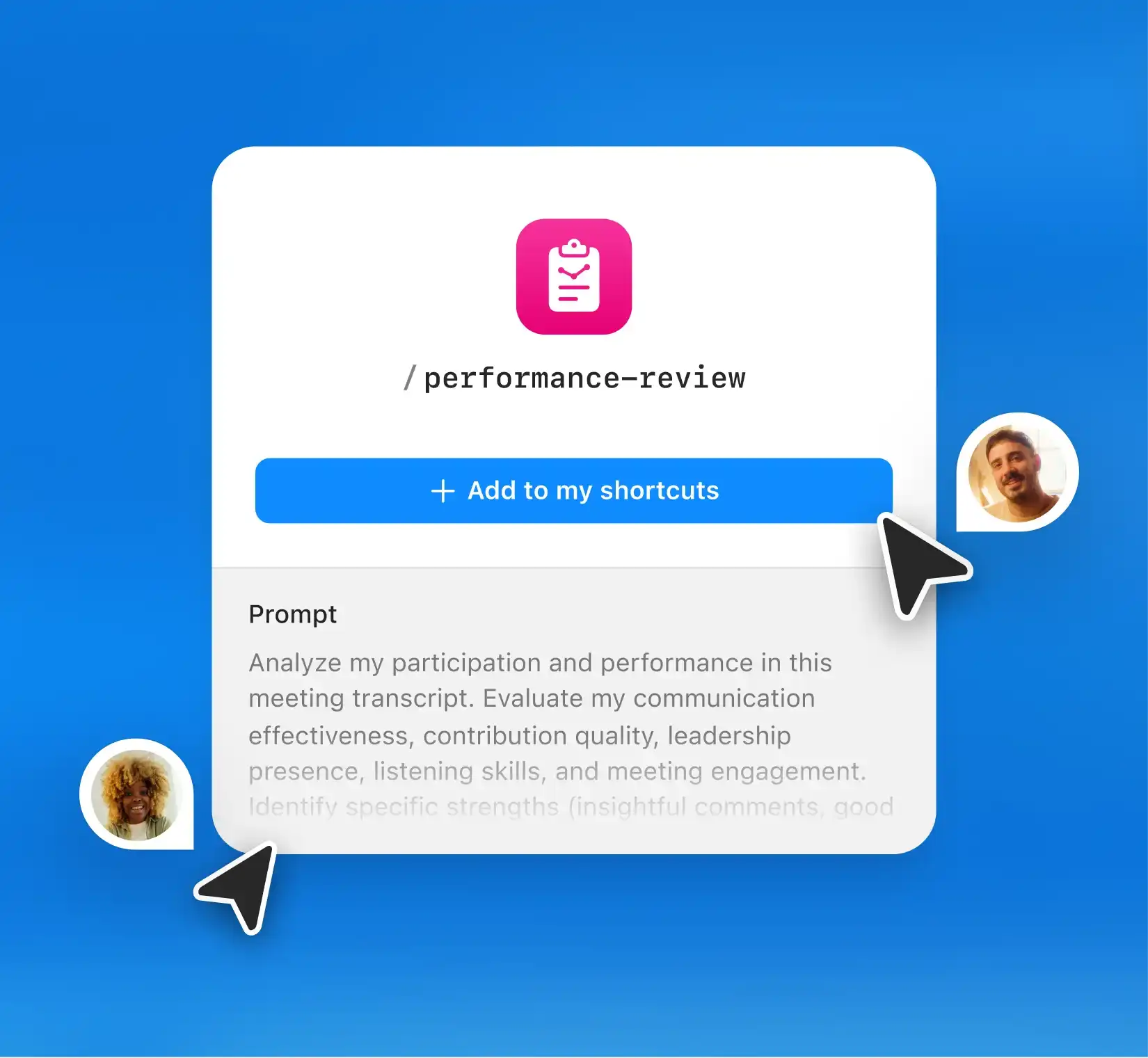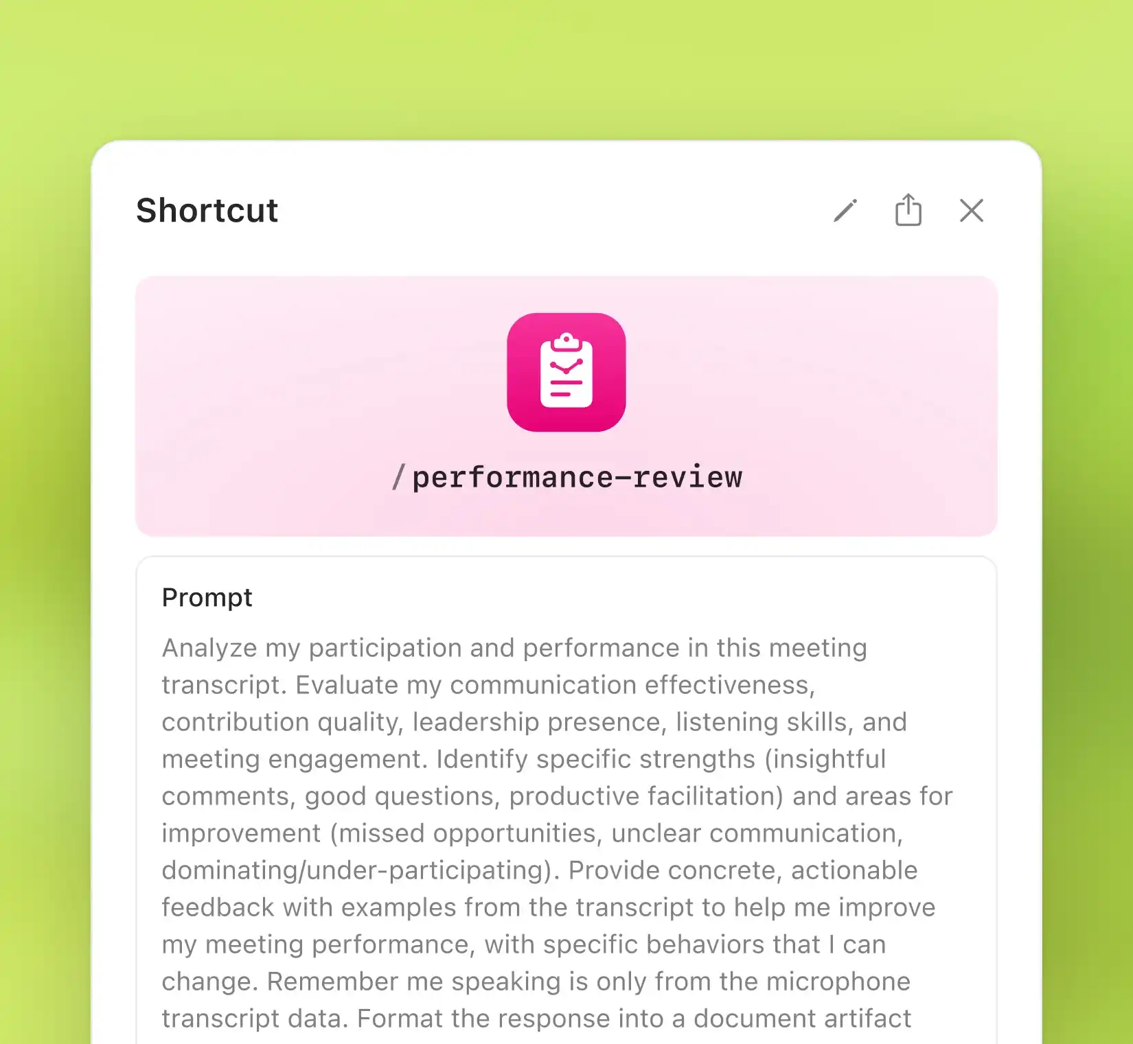 Shortcuts help you build the outputs you rely on, from follow-up emails and action items to project updates and invites. Edit them to match your workflow and reuse them anytime without rewriting a single prompt.
