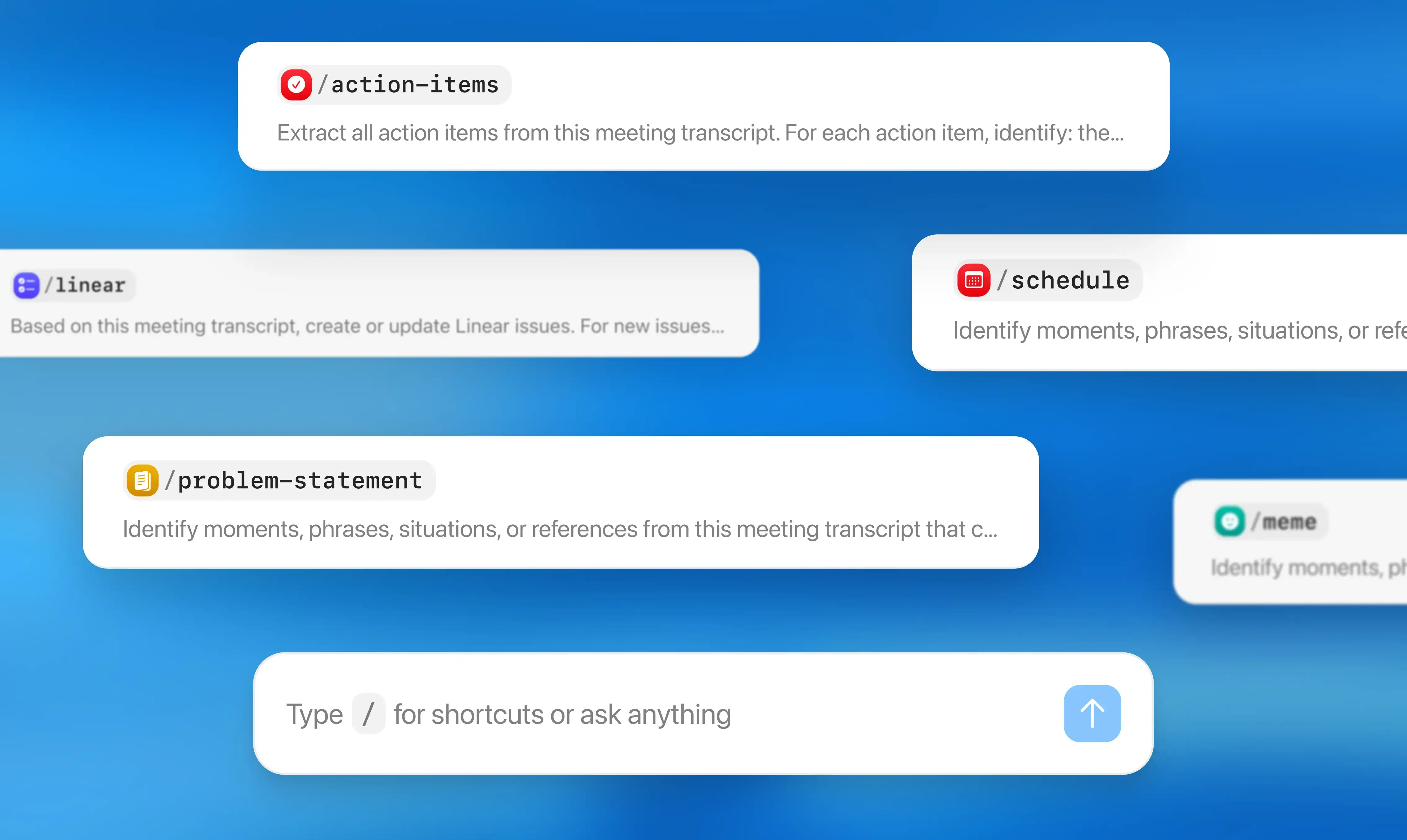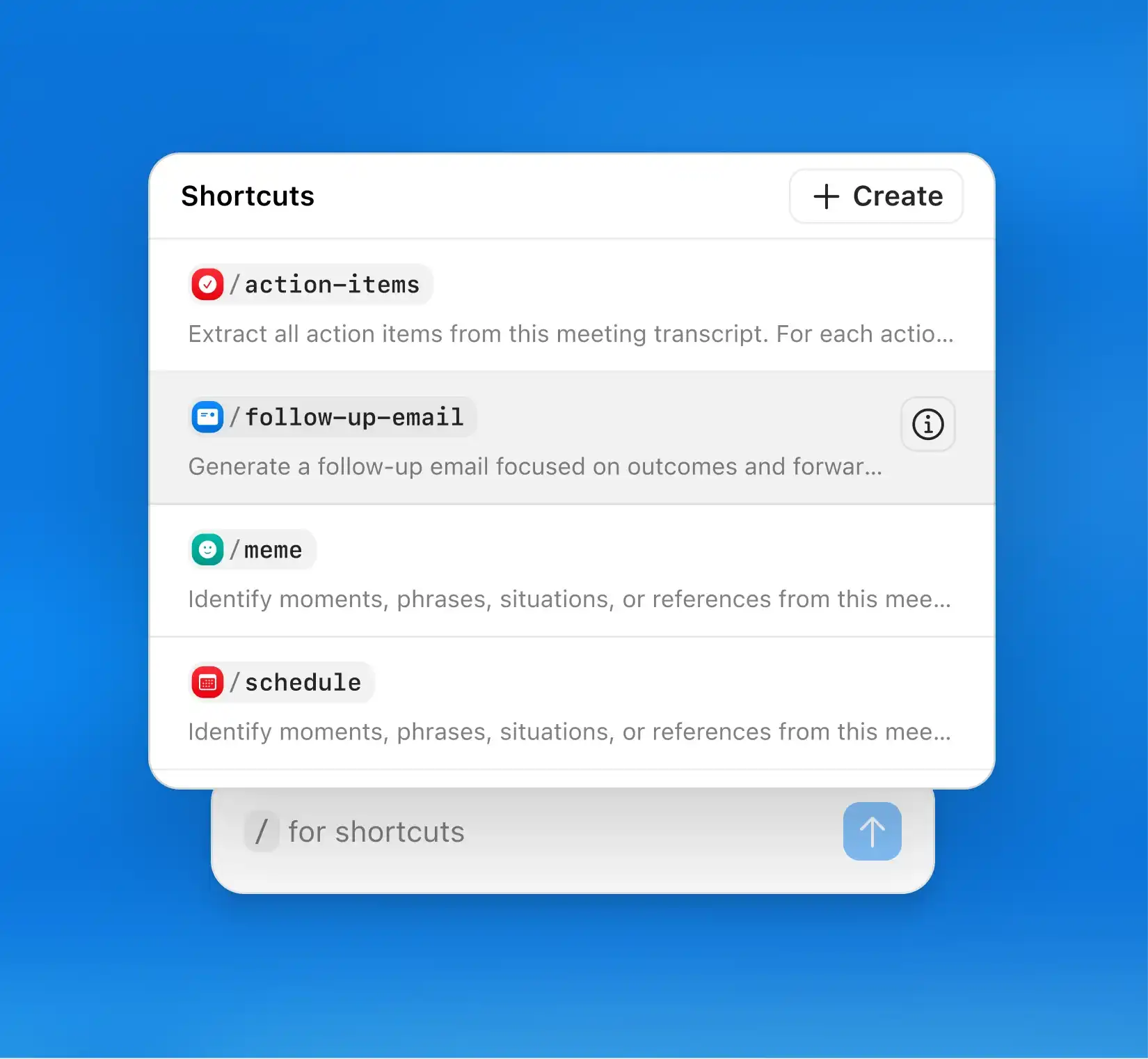 Use default shortcuts like /follow-up-email, /action-items, /schedule, or /meme, which pulls the most memeable moments from your meeting. Each one is ready to customize.