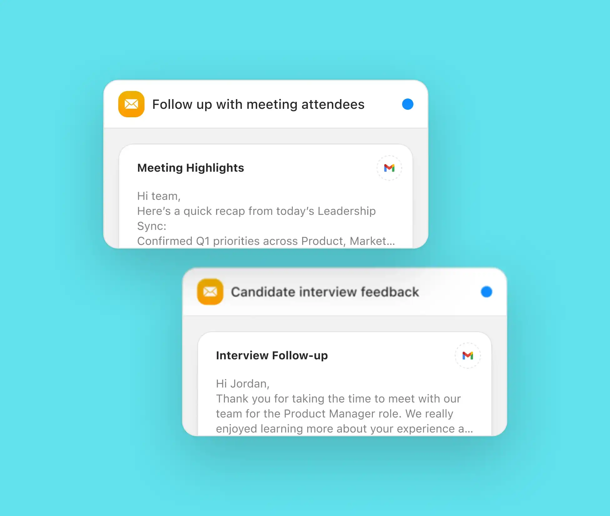 Radiant can draft all kinds of emails from personalized customer outreach to quick team follow-ups, making your email workflow more efficient and consistent with in-person conversations.