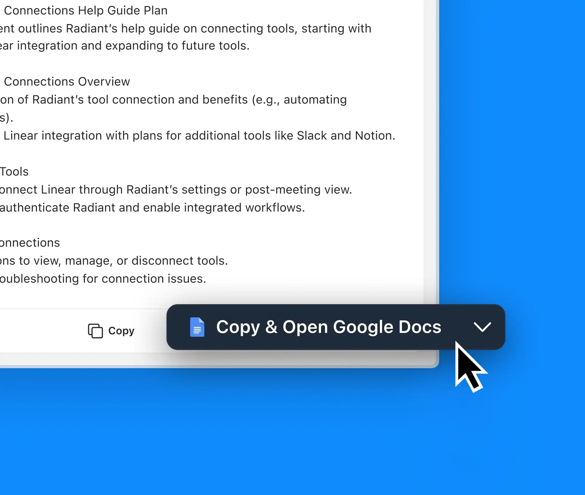 No complex setup required. Radiant automatically captures meetings in Google Meet, just attend your calls and Radiant generates actionable outputs afterwards.