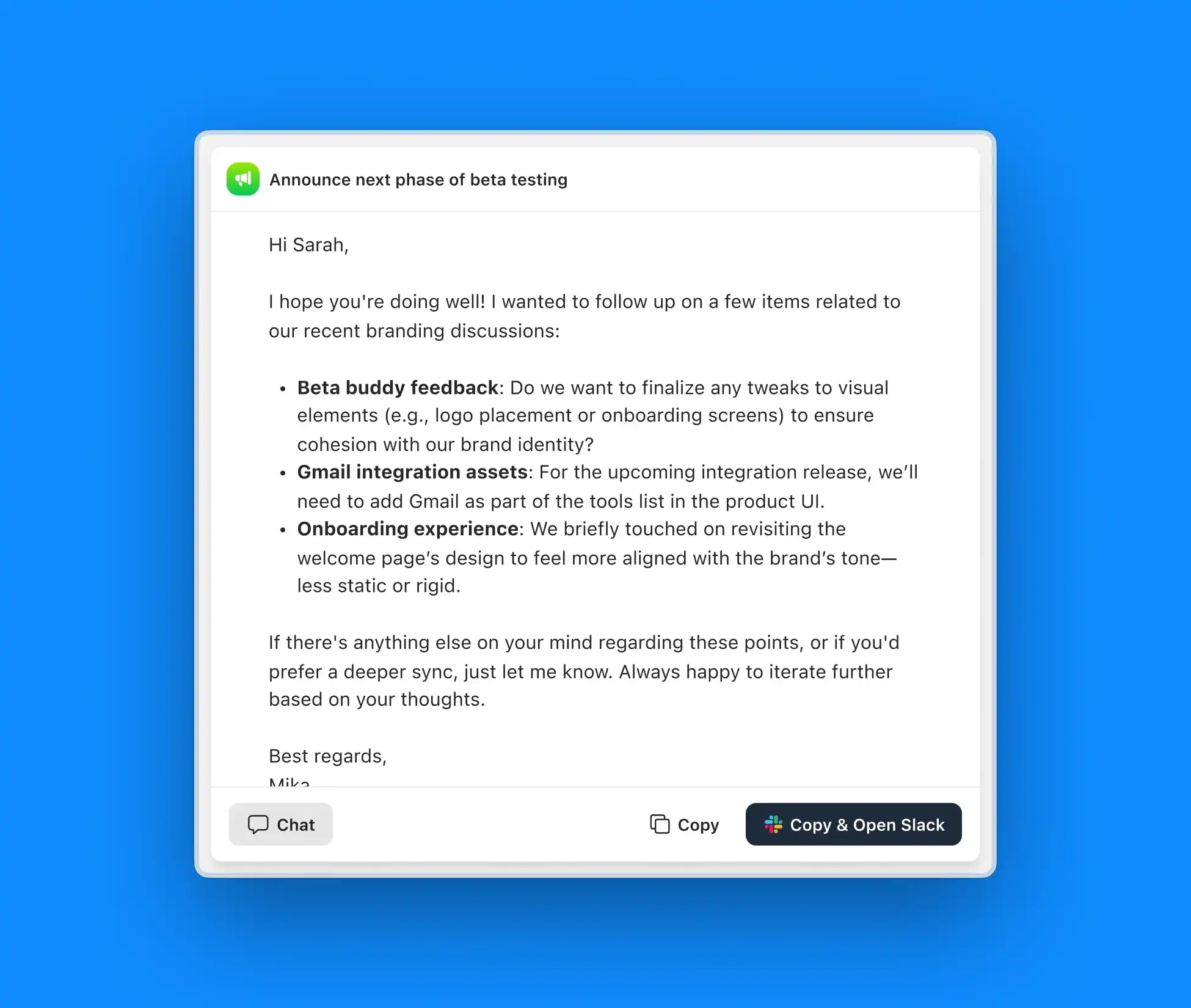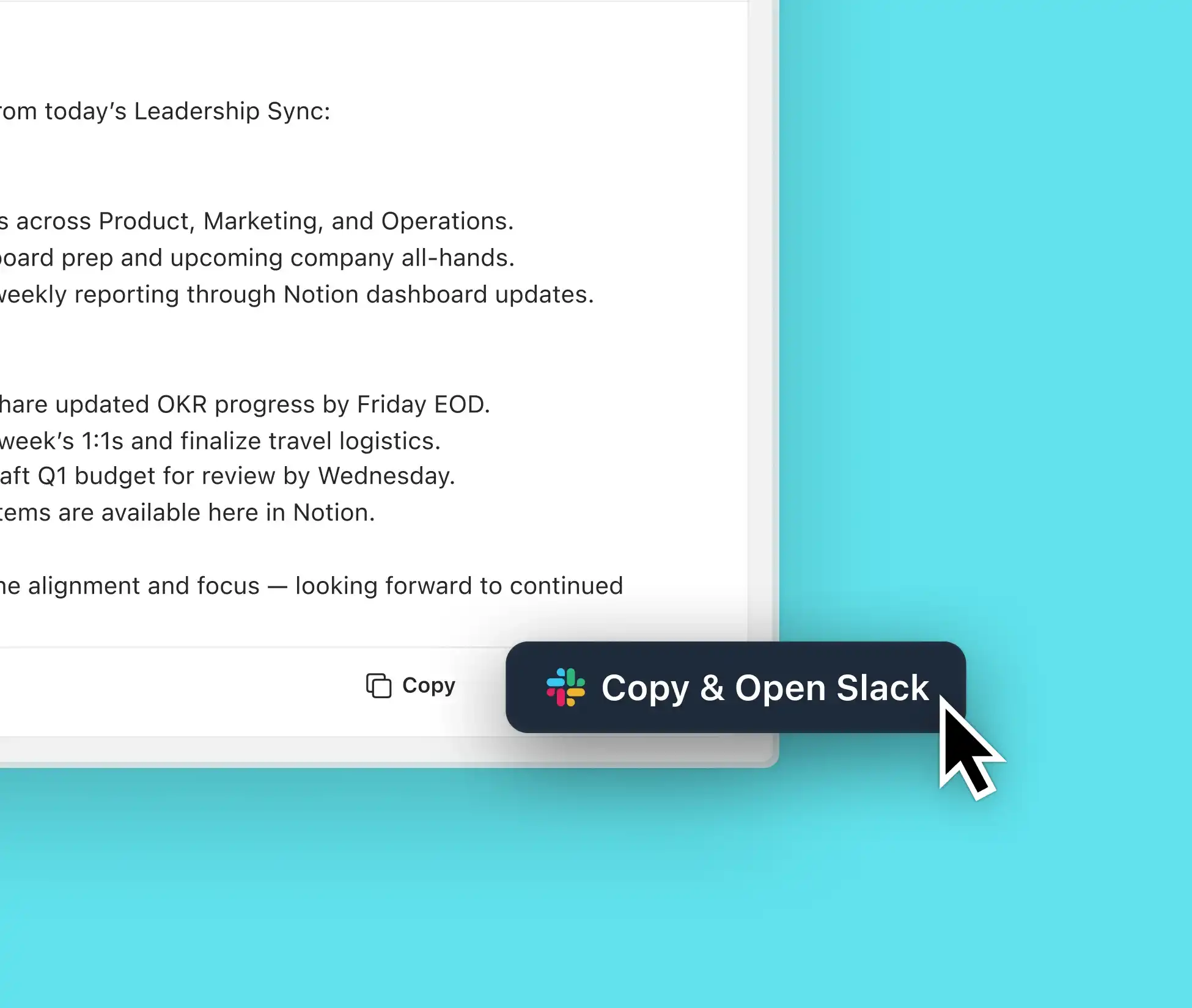 Turn meeting takeaways into concise Slack messages without rewriting everything yourself. Download the Mac app and keep your team aligned in less time.
