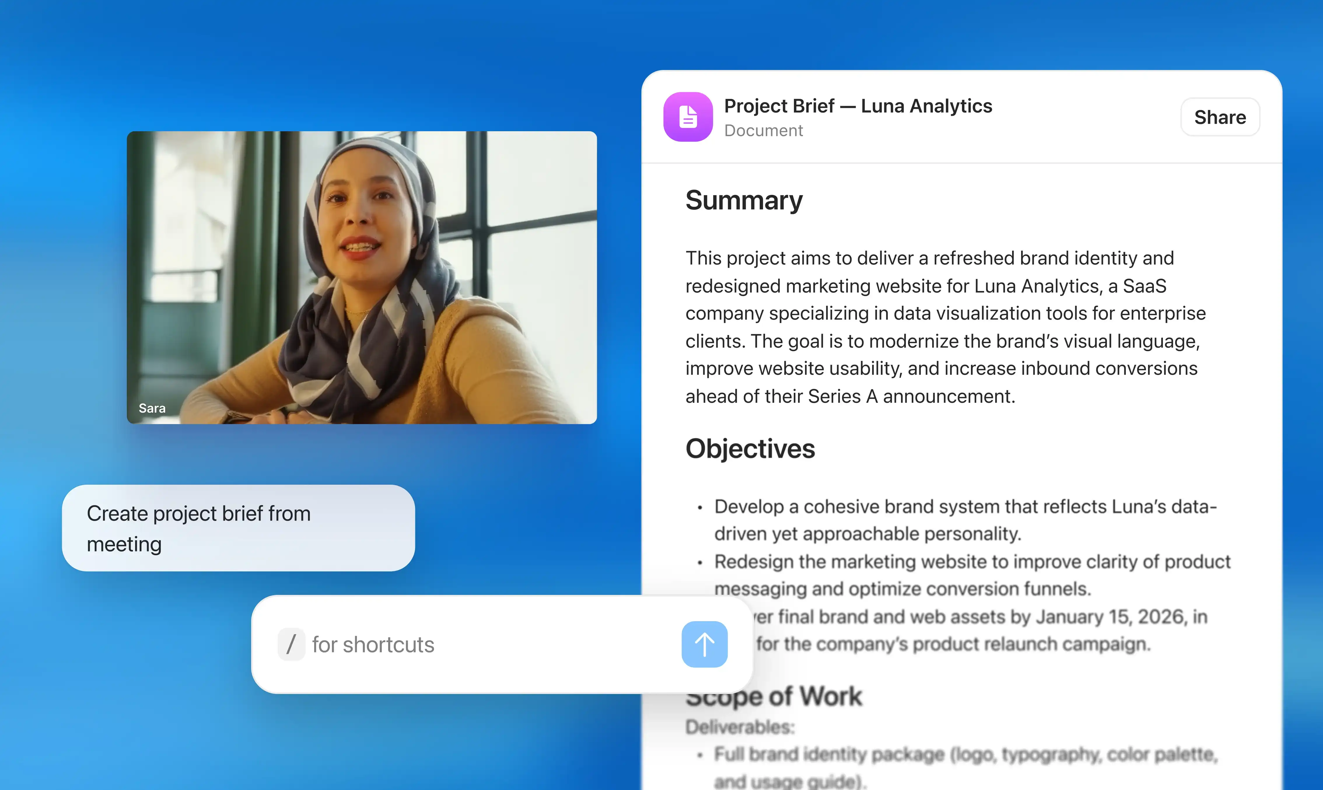 Freelancers don’t need another notetaker, they need an assistant that helps get the work done. Radiant captures conversations, drafts follow-ups, and prepares deliverables in your tools so you can spend less time on admin and prompting and more time creating stand-out work for clients.