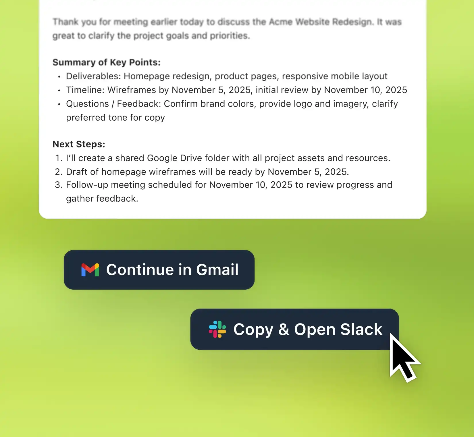 Radiant suggests next steps right after your call and drafts them for you at the click of a button. From emails to Slack updates, it opens drafts in your tools so you can review and send in seconds.