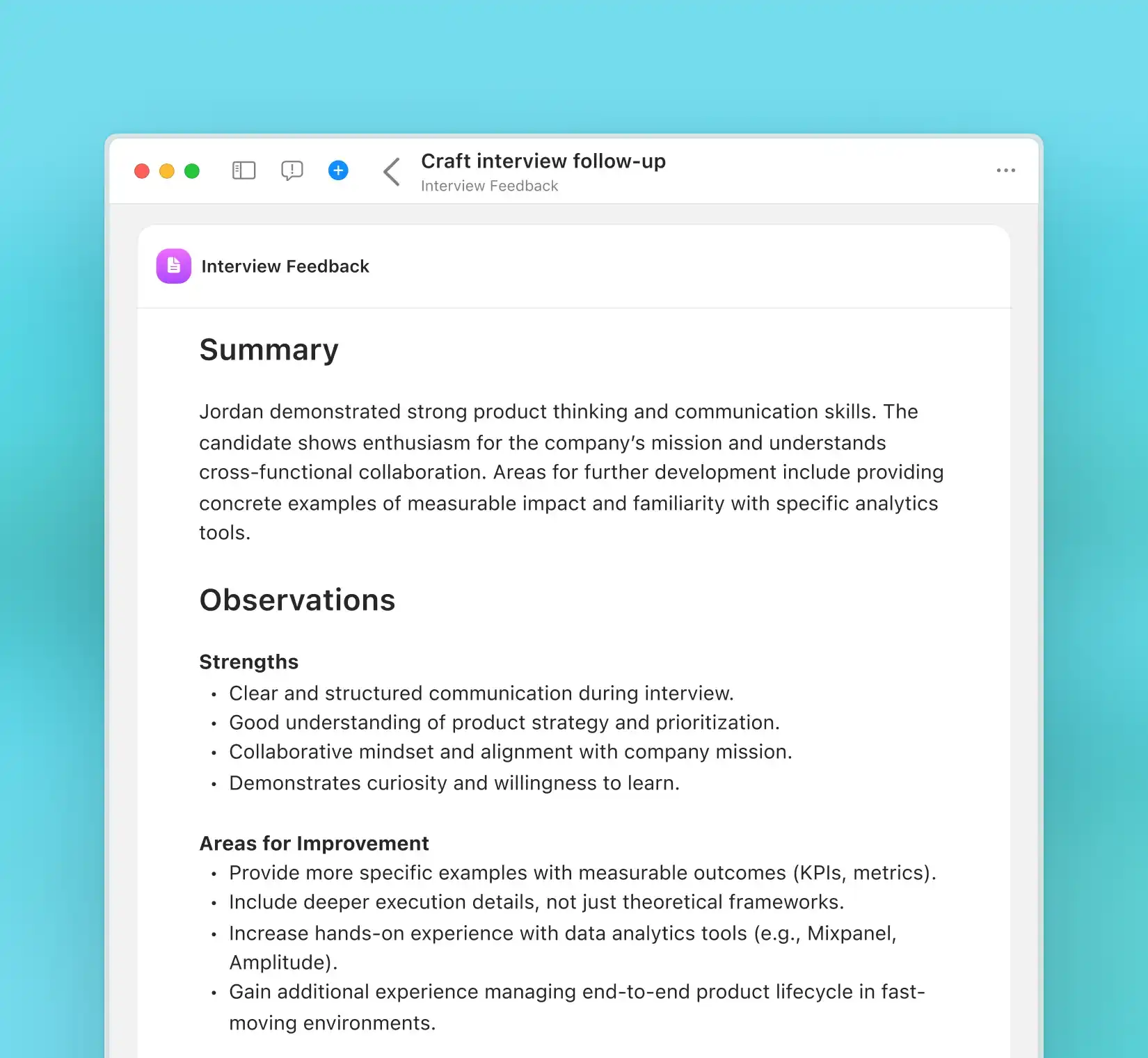 Radiant helps you turn conversations into work, preparing Google Docs for interview feedback or tickets in project tools to keep hiring workflows moving. Instead of stalling on admin, you can keep candidates engaged and processes on track.