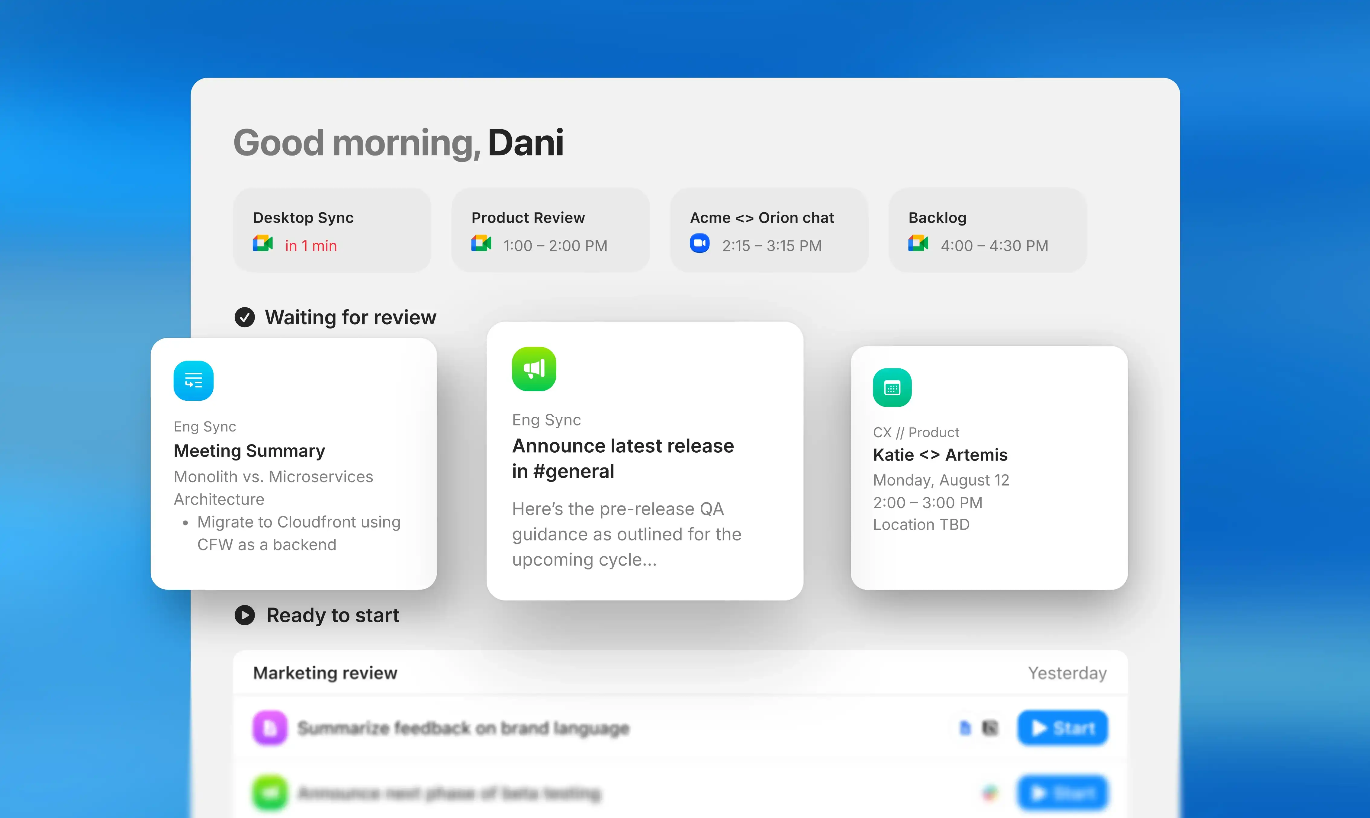 Radiant runs quietly on your Mac, capturing meetings the moment they begin with no meeting bot in sight. You get the context you need from customer calls and standups without disrupting the flow.